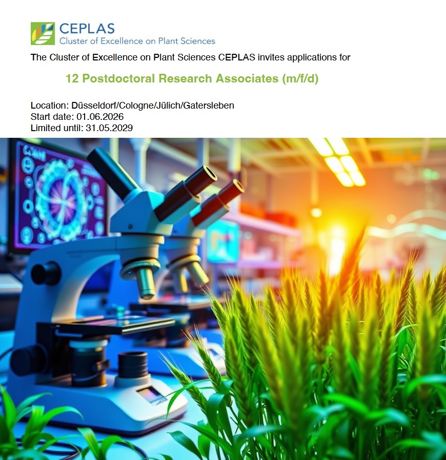 The Cluster of Excellence on Plant Sciences (CEPLAS) is recruiting 12 postdoctoral researchers for 2026–2029 in Germany. Explore funded research positions in genetics, computational biology, barley research, photosynthesis, and plant-microbe…
